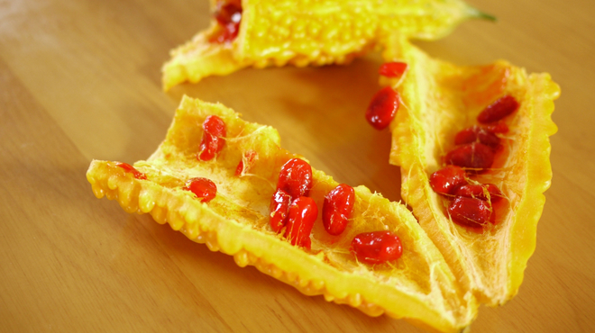 ゴーヤが完熟したあとも育て続けると、赤い種が中から飛び出してくることもあるのだとか。