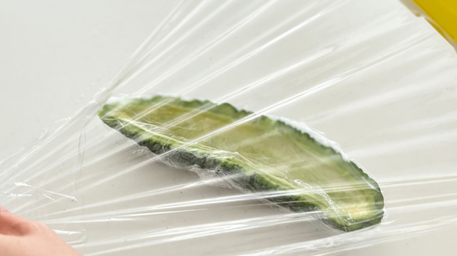 ゴーヤは、種とワタの部分から傷みやすくなるため、冷蔵保存する前に取り除いておくのがおすすめです。ゴーヤを縦半分に切り、スプーンで種とワタを削り取ったら、切り口にキッチンペーパーをあて、全体をラップでぴったりと包みます。