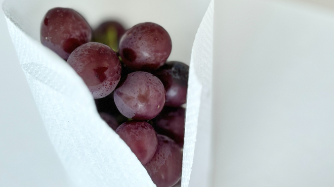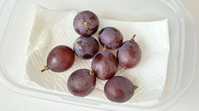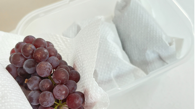 粒の小さなブドウはひと房ずつキッチンペーパーでくるんで保存容器へ移し、冷蔵庫の野菜室で保存しましょう。キッチンペーパーで包んでから保存容器に入れることで、乾燥を防ぎ、適度に水分を保つことができます。