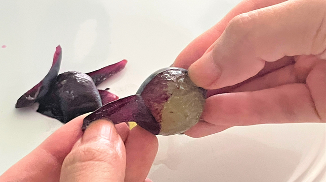 解凍せずに、シャーベットのようにお召し上がりください。流水でさっと洗えば、表面だけ溶けて簡単に皮を剥くことができます。
