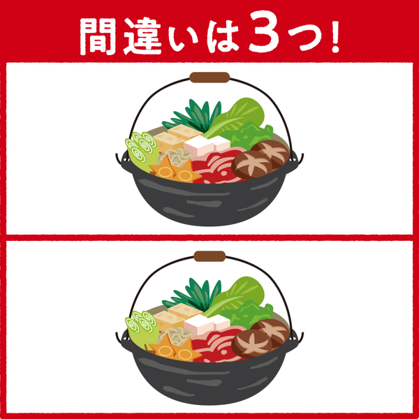 間違い探しに挑戦!ぐつぐつと煮込んだおいしそうな「すき焼き」のイラスト。この2つのイラストには、違うところが3つ隠れていますよ。さて、どこでしょうか?よーく見比べながら探してみてくださいね。