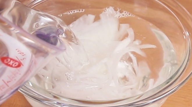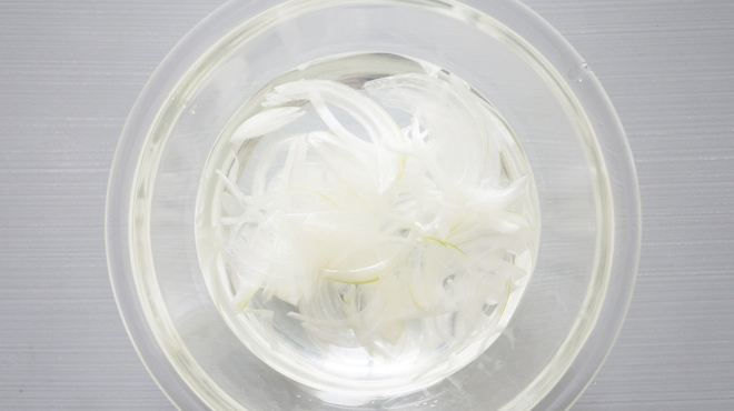 やり方は簡単!玉ねぎがかぶる程度の水に浸し、5分~10分程度水にさらします。長くさらしすぎると、玉ねぎの風味も抜けてしまうので気をつけてくださいね。