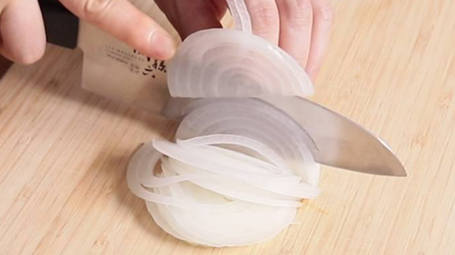玉ねぎの厚みがあると辛味が抜けにくいので、できるだけ薄く切るのがポイントです。