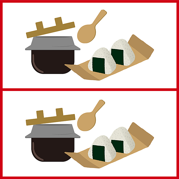 間違い探しです!2枚のイラストには、違うところが3つあります。さて、全部わかりますか?よく見て違いを見つけてみてくださいね。答え合わせの後は、イラストにあるおにぎりにちなんで、おにぎりのアレンジレシピをご紹介します。ぜひ最後までご覧くださいね。