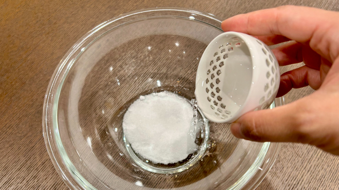 ①塩大さじ1に少量の水を加える(洗うレモンの個数に合わせて、塩の分量を調整しましょう)