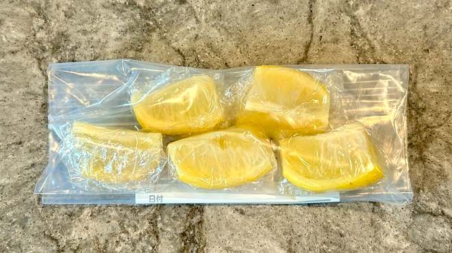 カットしたレモンをバットの上に重ならないように並べて冷凍庫で凍らせてから、冷凍用保存袋に移して保存するという方法もあります。10~15分ほど常温に置いておけば果汁を絞れる状態になりますよ。