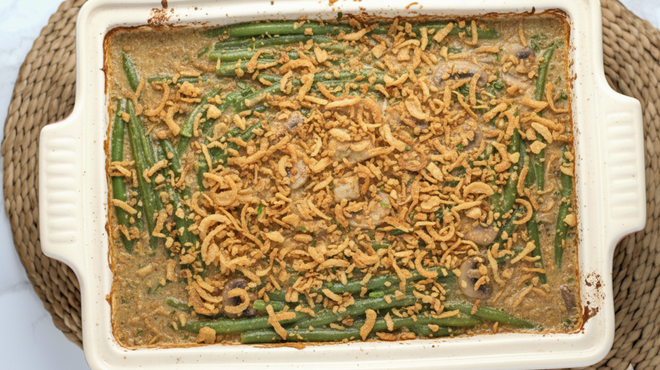 グリーンビーン・キャセロールもサンクスギビングデーの定番料理。グリーンビーンとはいんげんのことで、マッシュルームソースやマッシュルームスープで和えたいんげんとフライドオニオンをオーブンで焼いたものです。