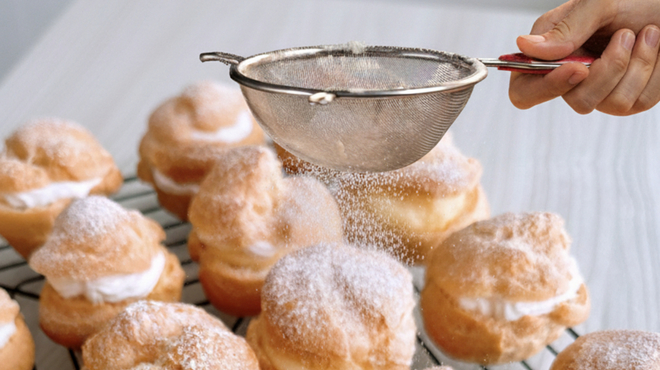 ケーキやシュークリームなどの仕上げに、粉砂糖をふりかけてデコレーションする使い方もあります。茶こしに入れてふるうことで、真っ白な雪やクリスマスをイメージさせるデコレーションが簡単にできますよ。