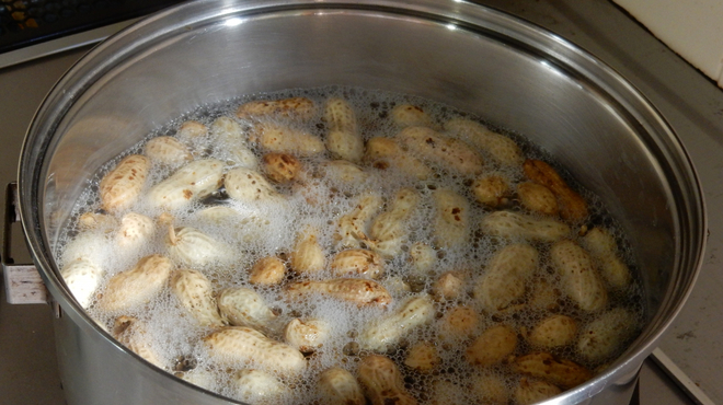 ②鍋にお湯を沸かし、お湯に対して3%の塩と落花生を入れ、落し蓋をする