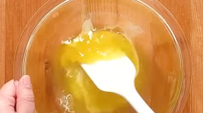 ②ボウルに溶かしバター、砂糖を入れ混ぜ、さらに溶き卵を加えて混ぜ合わせる。