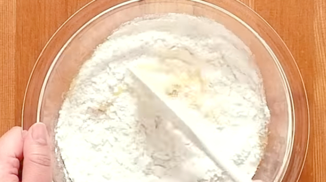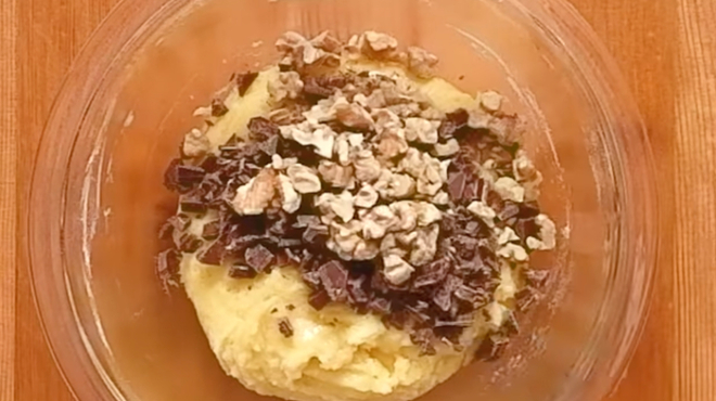 ③粉気がなくなり、ひとまとまりになったら、ミルクチョコレートとくるみを加えて混ぜ合わせる