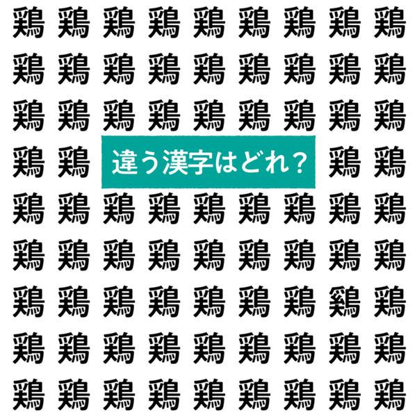 漢字間違い探しにチャレンジ!たくさん並んだ「鶏」の中に、ひとつだけ違う文字があります。さて、どれが違うか分かりますか?じっくり見比べて、答えを見つけてみてくださいね。