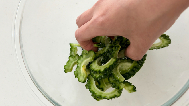 ゴーヤをあらかじめゆでてから保存しておくと、苦味がやわらぎ、時短調理にもなりますよ。軽く塩もみし、さっとゆでるだけで、食感よく風味を保ったまま冷蔵保存ができます。和え物や炒め物にすぐ使えるので、作り置きしたいときにもおすすめです!