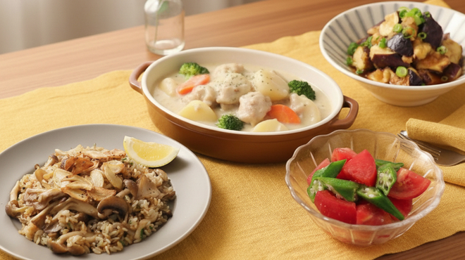 食べ応えのある和風シチュー献立をご紹介。主食にはきのこの旨味たっぷりガーリックバターライス、副菜にはゆず胡椒香るトマトとオクラの和風マリネ、さらにナスのおろし和えを合わせました。コクとさっぱり感が楽しめる献立です。