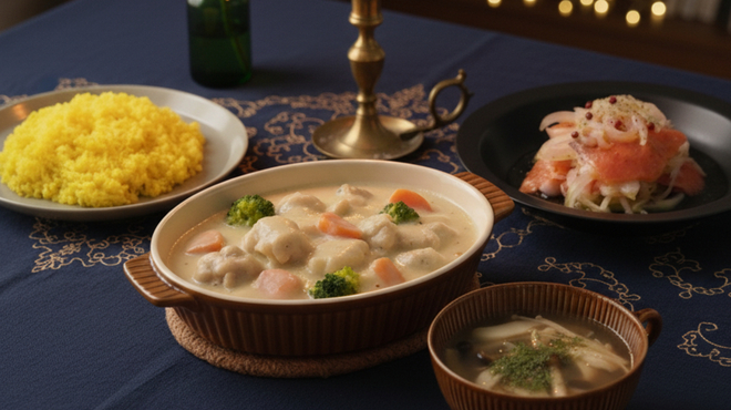 華やかな洋風シチュー献立をご紹介します。主食は色鮮やかなサフランライス、副菜にスモークサーモンと玉ねぎのマリネ、汁物にはバターとニンニク風味のきのこスープを合わせました。白色のシチューを引き立てる彩りも味わいも楽しめる、手軽に作れるバランスの良い献立です。