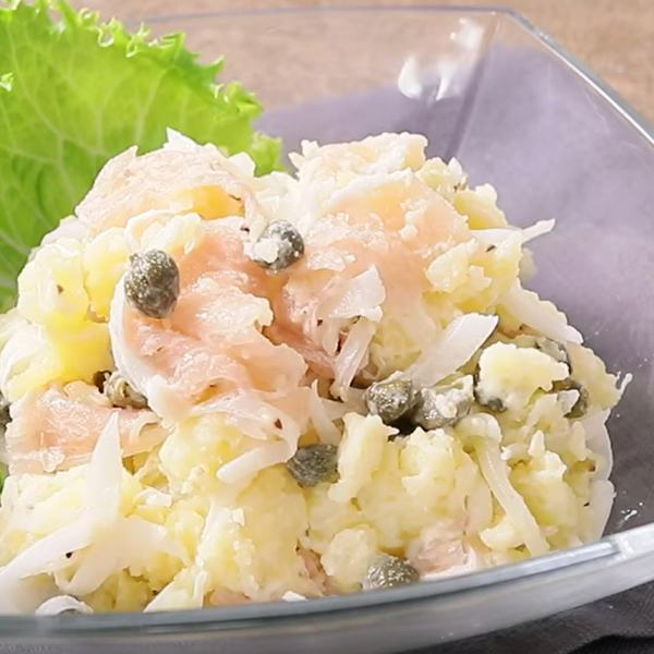 おつまみの定番!ポテトサラダを大人好みにアレンジしたレシピをご紹介します。つぶしたじゃがいもに生ハムとケーパーを混ぜこみ、見た目も味もおしゃれに仕上げた一品です。シャキシャキ食感の玉ねぎがアクセントになって、つい手が伸びてしまいますよ。粗挽き黒こしょうの香りがよく、お酒にもよく合うので、ぜひ作ってみてくださいね。