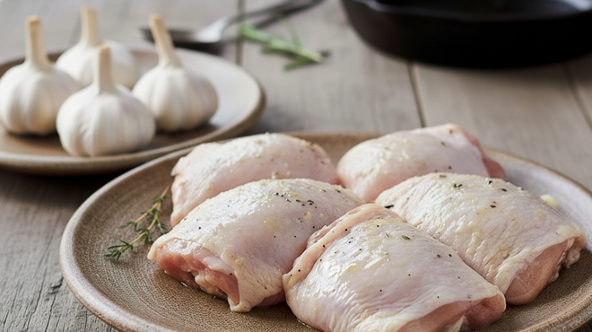 シュクメルリの最大の特徴は、ニンニクをたっぷり使うこと。「ニンニク好きにはたまらない料理」や「ニンニクを食べるための料理」といわれるほど、ニンニクが主役のこの料理では、1玉(約50〜60g)ものニンニクを贅沢に使います。