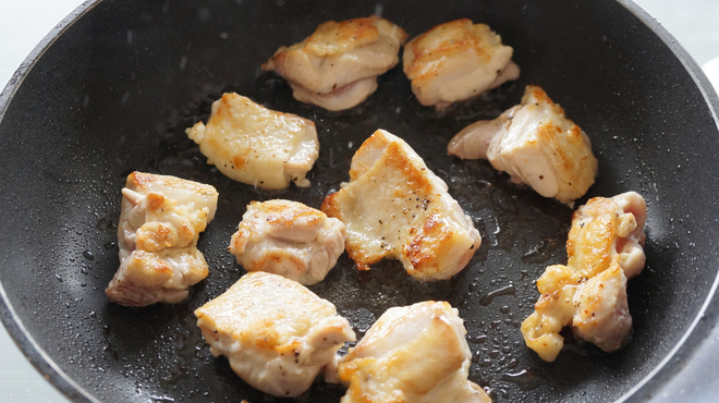 ②フライパンを中火で熱したら有塩バターを入れて溶かし、鶏もも肉を焼き色がつくまで焼く