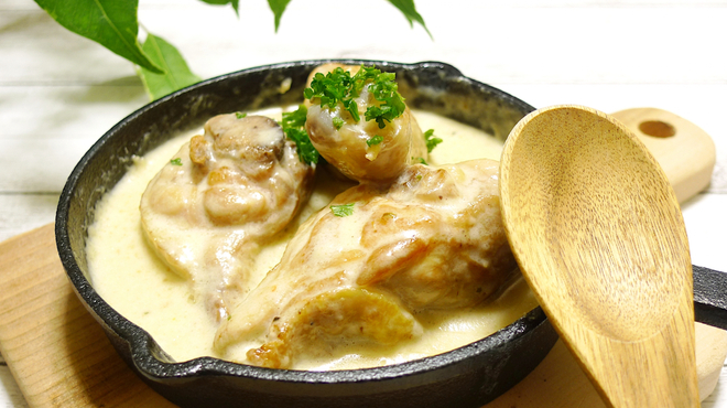 | 調理法 | 鶏肉を焼いたあと、にんにくソースで煮込む |