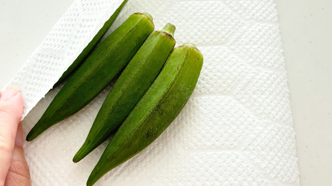 オクラの表面に生えている産毛とガクを取り除いておくことで、解凍後の調理がグンと楽になりますよ。霜がついて味が落ちる原因になるので、冷凍する前には水気をしっかりと拭き取りましょう。