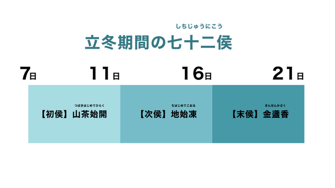 各節気で約5日間ごとに3つの期間に分けられ、それぞれ初候・次候・末候があるようです。以下で立冬期間中、季節がどのように移り変わるのか確認してみましょう。
