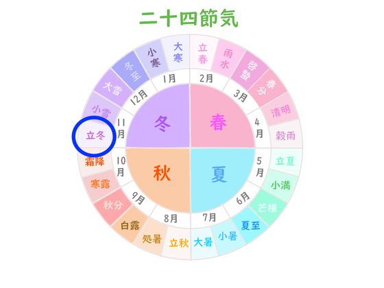 立冬の開始日は毎年変動しますが、基本的には11月7日か8日になることが多いようです。そして、暦の上では、立冬から立春前日までが「冬」となります。