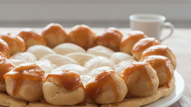 カラメルが固まったら土台にミニシューをのせ、お好みでホイップクリームやカラメルクリームを絞ったら、サントノーレのできあがりです!