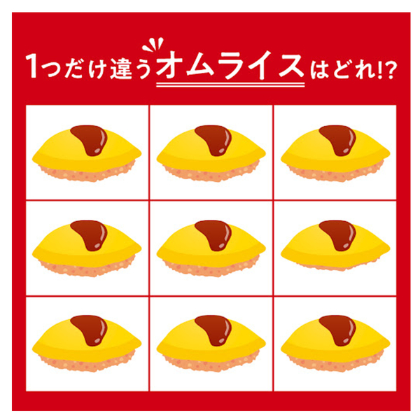 違う絵さがしです!9つあるオムライスのイラストの中に、1つだけ異なるイラストがあります。さて、その異なるイラストはどれでしょうか?よーく見て、探し当ててみてくださいね。