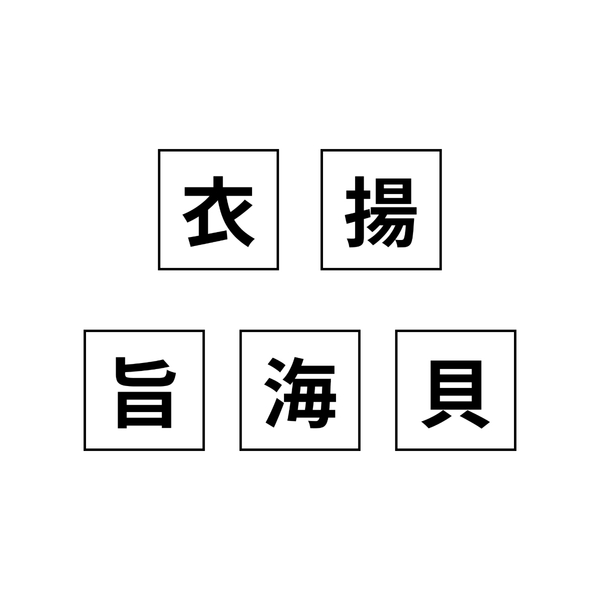 「衣」「揚」「旨」「海」「貝」のずらっと並んだ5つの漢字。ある食べ物から連想する漢字を挙げてもらうアンケートで上位になった文字なのですが、いったいどんな食べ物を表しているかわかりますか…?よーく見ていると、あの食べ物が思い浮かんでくるはず!