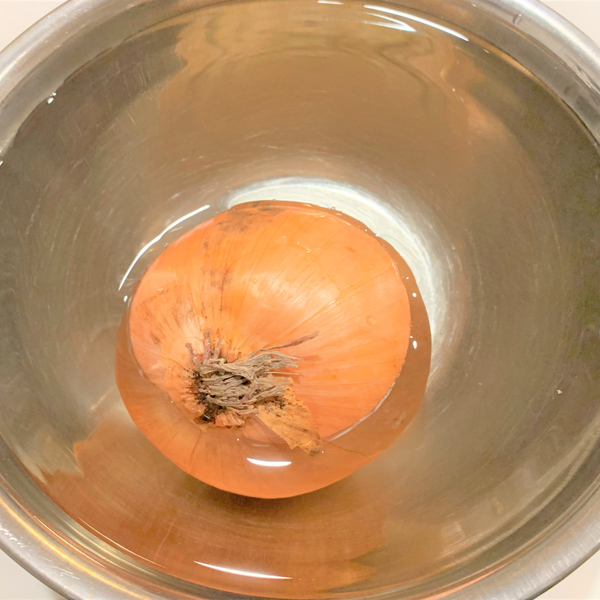 ①ボウルに水を張って、玉ねぎを皮ごと水に浸します。全体が浸からない場合はときどき転がしながら、3分ほど浸してくださいね。