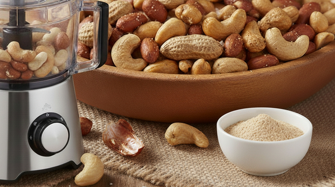アーモンドプードルの代用品として一番おすすめなのは、ピーナッツやカシューナッツなどのナッツ類。フードプロセッサーにかけて粉末にしたもので代用すると、アーモンドプードルと同じように香ばしい風味を出せます。