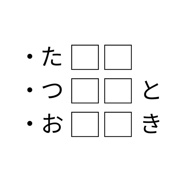 穴埋めクイズです!四角に入る共通の2文字の食べ物はなんでしょうか?昔ながらのおやつとして昔話にも登場する、あの食材の名前ですよ。いろんな言葉を当てはめて、よーく考えてみてくださいね。