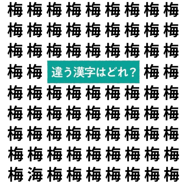 漢字間違い探しです!たくさん並ぶ「梅」の中に、ひとつだけ違う漢字があります。さて、どれが違うか分かりますか?じっくり見比べて、答えを見つけてみてくださいね。