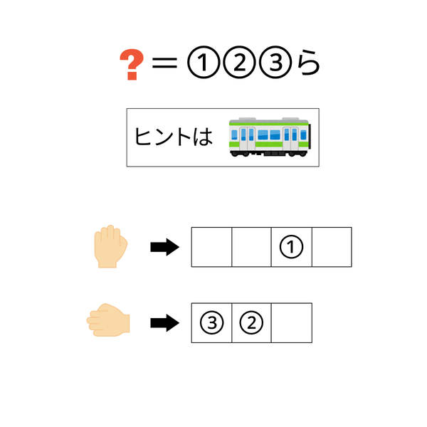 ここでもう一度画像を見てみると、ヒントとして「電車」が提示されています。電車で握るものといえば…「つり革」と「手すり」がありますよね!上向きにつかむのは「つりかわ」、横向きにつかむのは「てすり」。矢印の先の文字数とも一致しそうです!