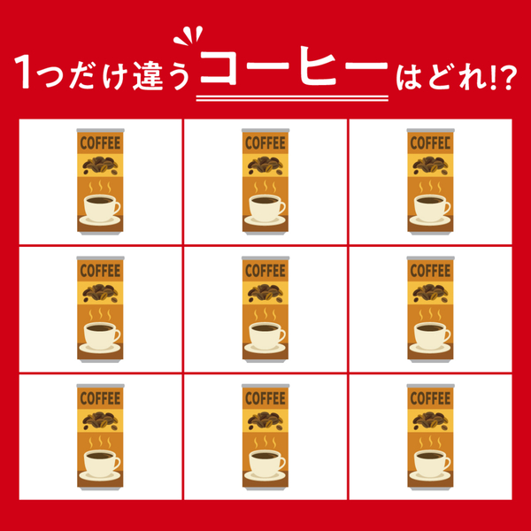 違う絵さがしに挑戦!缶コーヒーのイラストのなかに、ひとつだけ違うものが隠れていますよ。さて、どれが違うでしょうか。よーく観察しながら当ててみてくださいね。