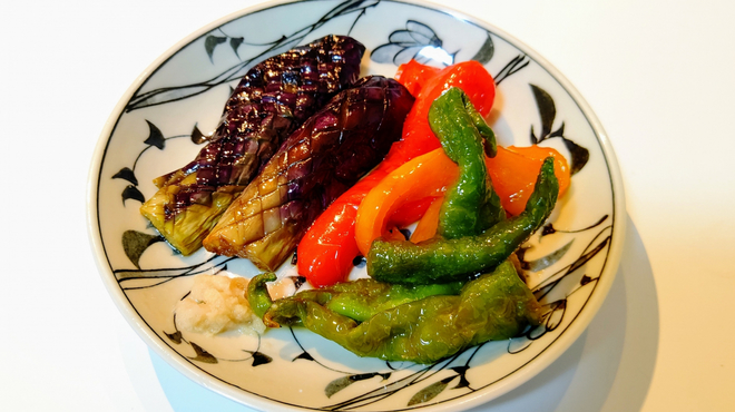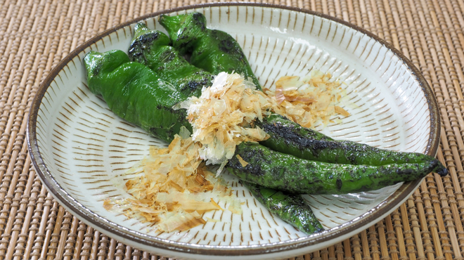 焼くだけでおいしいのも、万願寺とうがらしの大きな魅力です。焼き万願寺とうがらしは、生姜じょうゆやかつお節をかけるだけで、素材の甘みをじんわりと味わえます。