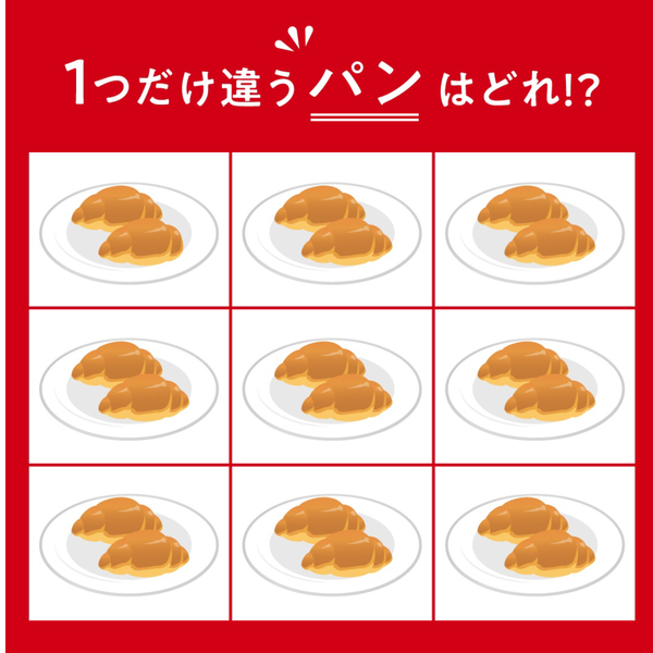 答えは、「上段いちばん左のマス」でした!よく見ると、下側のロールパンの右端がなくなっていますね。