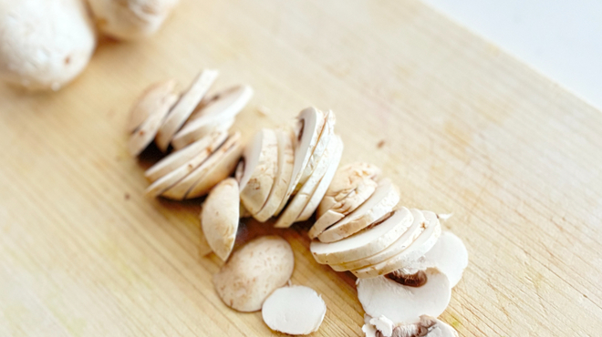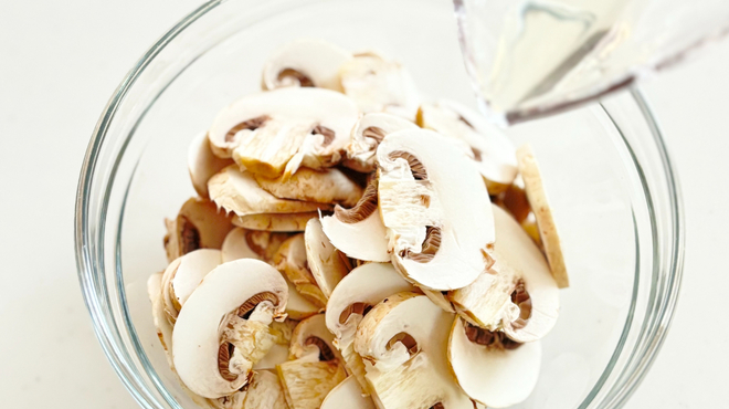 マッシュルームの切り口は空気に触れると酸化し、黒く変色してしまいます。カットしたらすぐにレモン汁をかけ、変色を防ぎましょう。