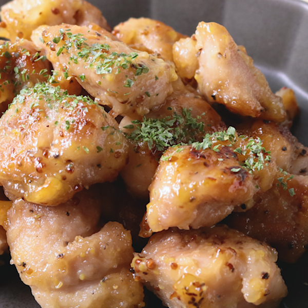 ひと口サイズでパクッと食べられる、ハニーマスタードチキンを作ってみませんか?はちみつの自然な甘みと、粒マスタードのピリッとした辛みのバランスが魅力のハニーマスタードソースが絶品!カリッと香ばしく焼いた鶏もも肉によく絡み、肉の旨みを一層引き立ててくれますよ。ぜひ作ってみてくださいね。