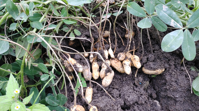 花が咲いた後、子房柄(しぼうへい)と呼ばれるツルが地中にもぐり、その先に殻付きの実がなることから「落花生」という名前になりました。南京豆やピーナッツ、地豆などさまざまな名前で呼ばれますが、落花生は殻つきのものを指すのに対し、ピーナッツは殻から取り出した豆を指すことが多いようです。
