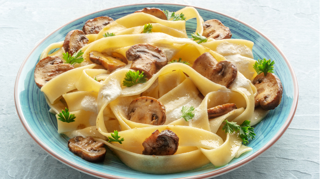 定番のペペロンチーノも、パスタをフェットチーネに変えるとおしゃれに仕上げることができます。マッシュルームとパセリのシンプルな具材で、パスタ本来のおいしさを存分にお楽しみくださいね。