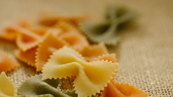 蝶やリボンの形をしたかわいらしいパスタです。薄い部分はやわらかく中心部分はアルデンテと、一口でふたつの食感を楽しむことができます。
