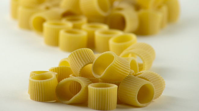 「線を引く」が語源の、直径8〜15mmの円筒パスタです。マカロニより太く表面に筋が入っており、もちもちと食べ応えのある食感を楽しむことができます。
