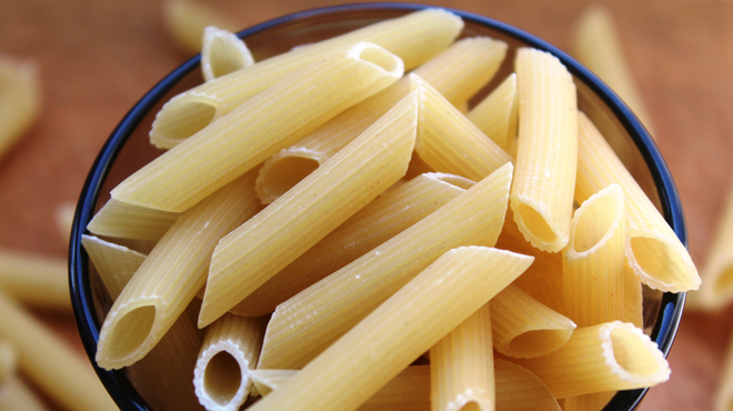 「ペン先」が語源の、先が尖った円筒パスタです。定番の料理はペンネ・アラビアータで、特にトマトソースと相性抜群です。