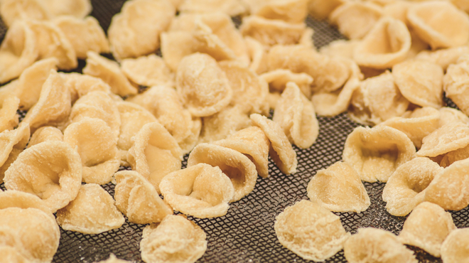 「耳たぶ」や「赤ちゃんの耳」という意味のドーム型をしたパスタです。丸い生地を親指の腹で押してくぼみを作ります。