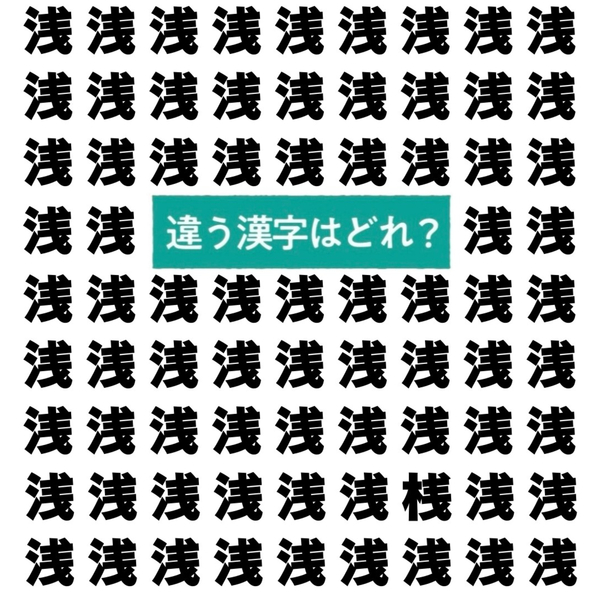 ずらっと並んだ「浅」の漢字。この中にひとつだけ、ほかと違う漢字が紛れていますよ。さて、どれでしょうか?よーく観察しながら答えを当ててみてくださいね。
