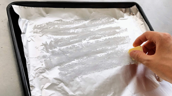 クッキーやパンなどを焼くときは、天板にアルミホイルを敷き、表面にバターやサラダ油を塗るとクッキングシートの代わりになります。天板に直接油を塗る方法もありますが、焦げ付きやすく、後片付けも大変になるため、【アルミホイル+油脂】の組み合わせがおすすめです。