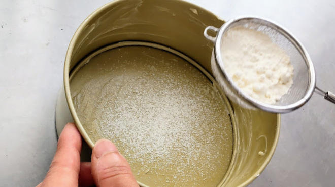 油脂を塗るだけでもよいですが、薄力粉をまんべんなくふるってまぶすことで、型からきれいに外すことができるようになりますよ。