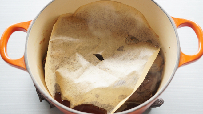 蒸気を逃がすための穴をしっかり開け、蒸気で膨らんでしまわないようにするのがポイント。厚手のキッチンペーパーを使うと、煮込んでいる途中に破れにくいのでおすすめです。
