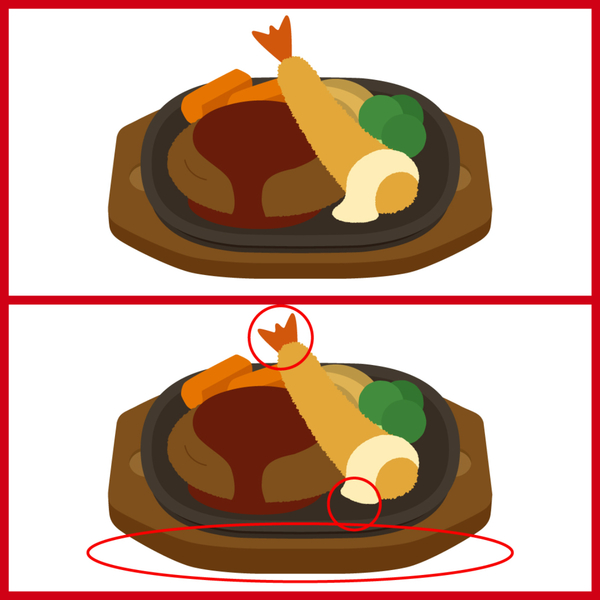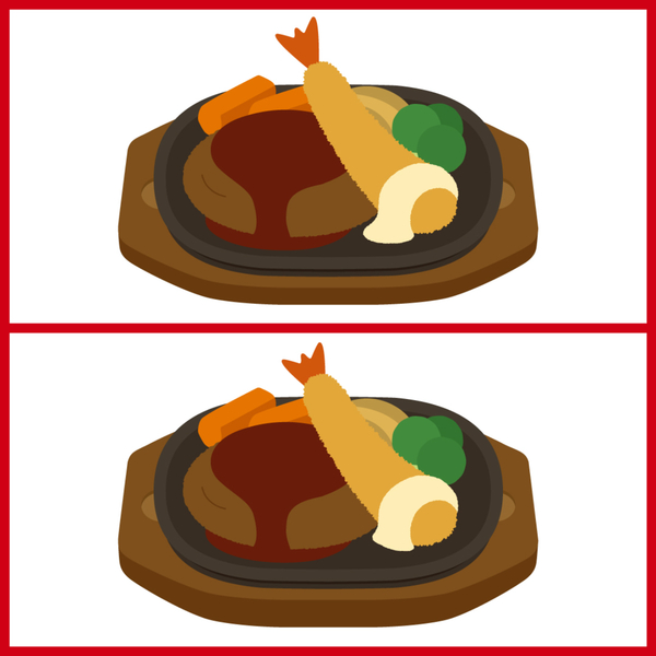 おいしそうなハンバーグプレート!この2つのイラストには違うところが3つあります。さて、どこが違うでしょうか。この間違い探しクイズは、「激ムズ」バージョン!よーく観察して、答えを当ててみてくださいね。